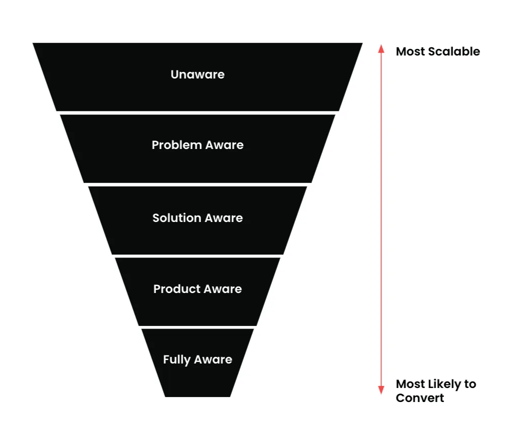 This helps us uncover the pain points, desires, language, and triggers that customers actually respond to — and that fuels the messaging angles behind every ad. We also map our creative approach across the 5 Levels of Market Awareness (from unaware to most aware) to ensure we’re